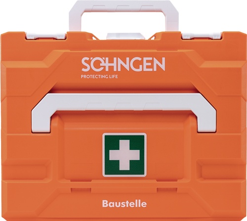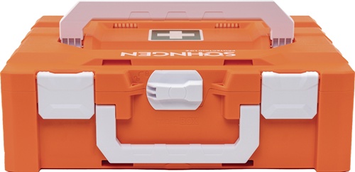 Erste Hilfe für die Baustelle · Inhalt: Füllung nach DIN 13157 plus Zusatzfüllung Baustelle · die metaBOX ist mit gängigen Koffersystemen kompatibel dank Multi-Adapter-Platte (L-BOXX, Systainer T-Loc & Classic Line, TSTAK, MacPac, Metaloc) · Kofferfarbe: orange