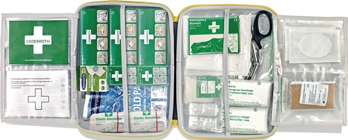 Füllung nach DIN 13157 · gut ausgestattetes Erste-Hilfe Kit aus dickem, strapazierfähigem Material · die Produkte stecken in durchsichtigen Kunststoffhüllen, um einen guten Überblick zu ermöglichen · Platz für Produkte nach eigener Wahl · mit Reißverschluss