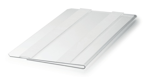 aus transparenter PET-Hartfolie mit rückseitigen Permanent-Klebestreifen für die Kennzeichnung von z.B. Kunststoffbehältern, zur Anwendung an Regalen, Kunststoffbehältern, Holz und Kartonagen · Klebestreifen rückstandsfrei ablösbar · scannertauglich und dokumentenecht · Innenformat: 150 x 67 mm (B x H) · schneller Austausch der Einsteckschilder durch abgeschrägte Vorderkante · passende bedruckbare Einsteckschilder auf Anfrage erhältlich