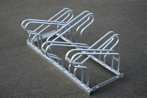verschraubt · platzsparendes Parken der Fahrräder durch abwechselnde Tief-/Hochstellung · Radabstand 350 mm · stabile, feuerverzinkte Stahlkonstruktion mit robusten Rundrohr-Bügeln Ø 18 mm · wahlweise für ein- oder zweiseitige Radeinstellung · Bügelabstand für Reifenbreite bis 55 mm · zur Reihenverbindung und Bodenbefestigung geeignet · zerlegt im Karton, Schrauben und Montageanleitung beiliegend · einfache Montage