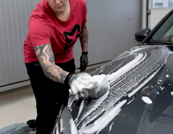 Schwamm vor der Anwendung anfeuchten. Dazu in den Wascheimer eintauchen und viel Wasser in den Schwamm aufnehmen, um das Fahrzeug schonend abzureinigen.