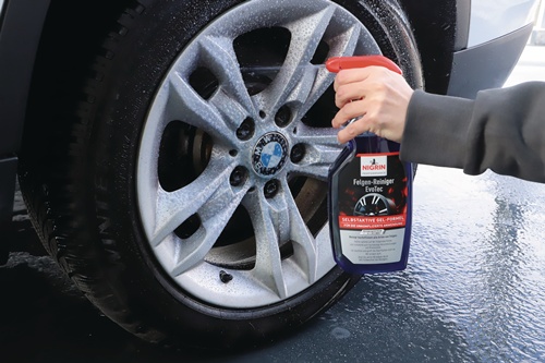 optimierte Gelformel · bildet einen flächigen Film, der an der Felge haftet ohne abzulaufen · verbessert Haftung und Einwirkdauer der selbstaktiven Substanzen · greift die Felgenoberfläche nicht an · entfernt schnell, schonend und zuverlässig Bremsstaub, Ölrückstände und Straßenschmutz · säurefreie Rezeptur · für alle Stahl- und Leichtmetallfelgen, auch mit lackierten, verchromten, polierten und matten Oberflächen · geprüfte Materialverträglichkeit · RDKS-geeignet · milder Duft