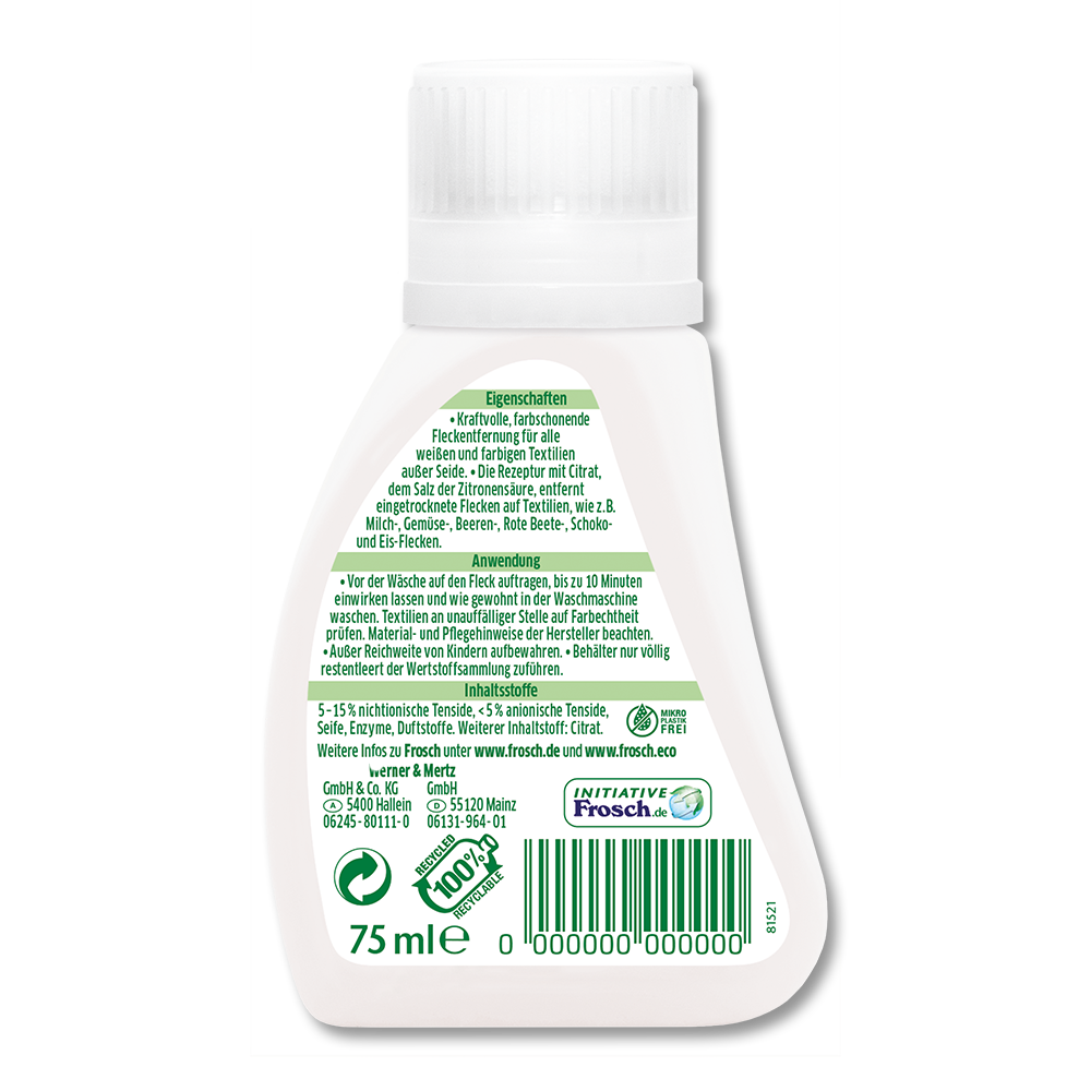 - Der Frosch Baby Flecken-Zwerg ist ein kraftvoller Flecklöser zur schnellen und effektiven Wäsche-Vorbehandlung. Der farbschonende Fleck-Entferner ist für für Weiß- und Buntwäsche sowie für alle Textilarten außer Seide geeignet. Die leistungsstarke Rezeptur mit Citrat, dem Salz der Zitronensäure, entfernt zuverlässig fett- und pigmenthaltige Flecken wie z. B. Milch-, Gemüse-, Beeren-, Rote Beete-, Schokound Eis-Flecken.