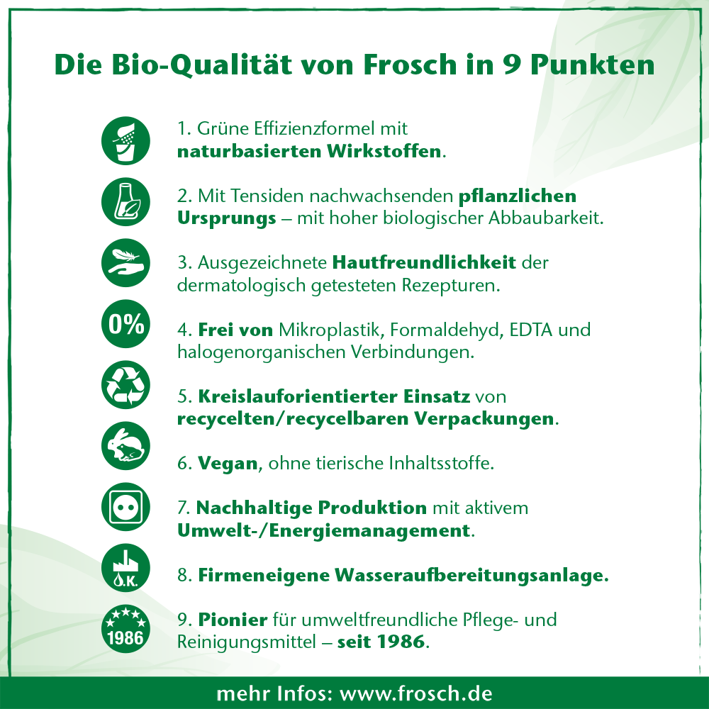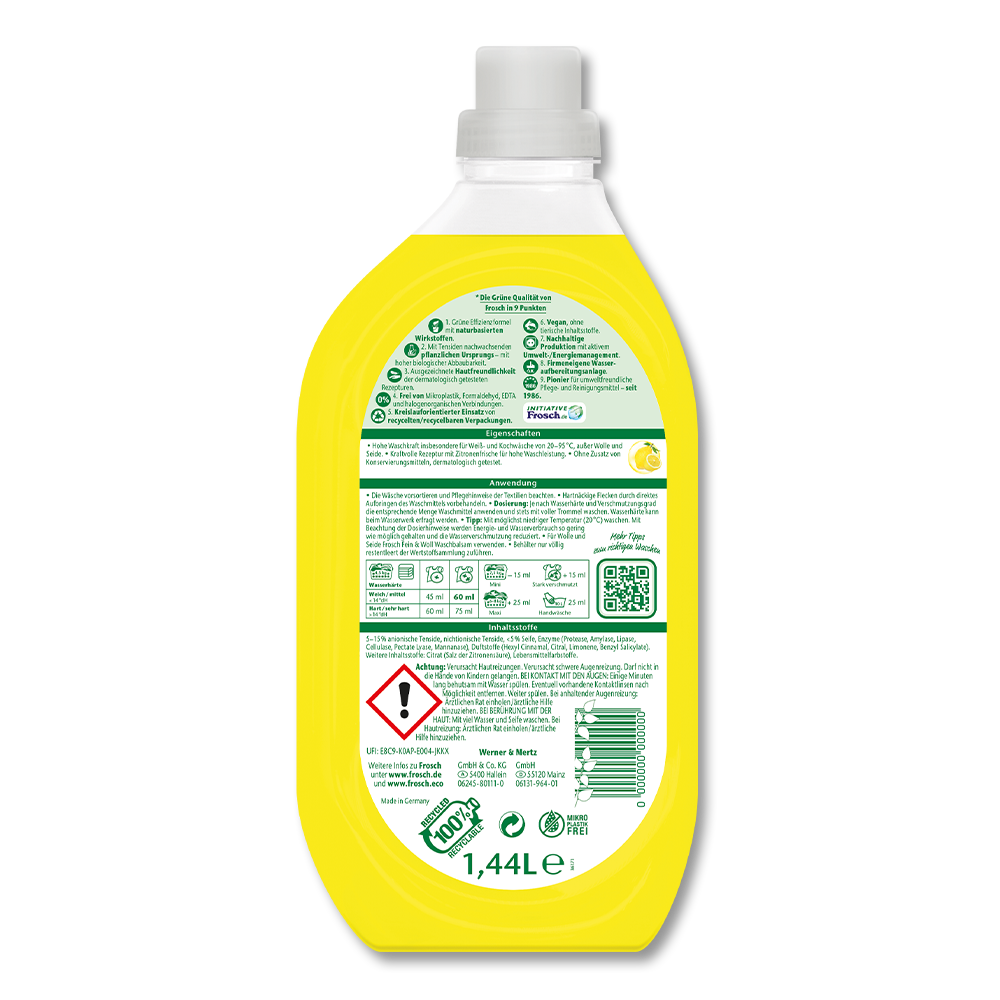 - Das Frosch Citrus Voll-Waschmittel für hohe Waschkraft von Weiß- und Kochwäsche von 20 bis 95° C. Nicht geeignet für Wolle und Seide. Die kraftvolle Rezeptur mit Zitronenfrische sorgt für hohe Waschleistung, beseitigt hartnäckige Flecken und hinterlässt einen angenehm frischen Zitronenduft. Ohne Zusatz von Konservierungsmitteln. Dermatologisch getestet.