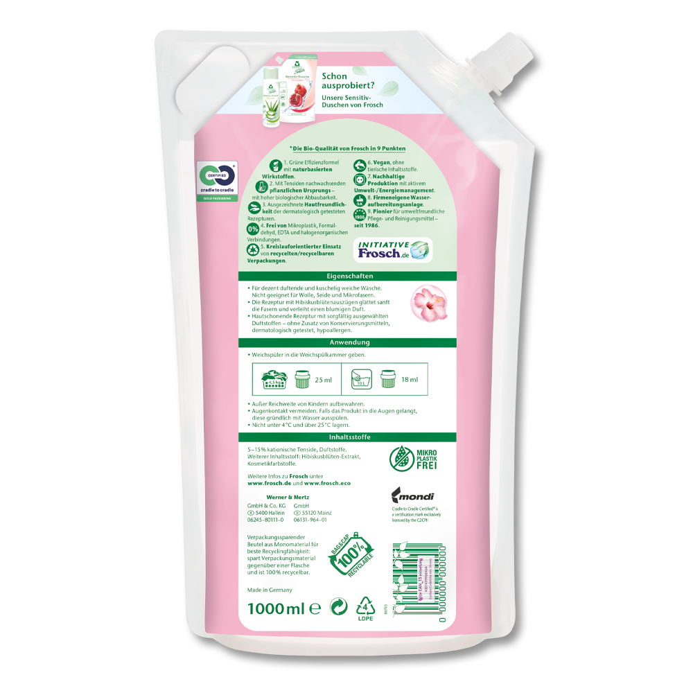 - Der Frosch Hibiskusblüte Sensitiv-Weichspüler ist vegan und sorgt auf pflanzlicher Basis für duftende und kuschelig weiche Wäsche. Nicht geeignet für Wolle, Seide und Mikrofasern. Die Rezeptur mit Hibiskusblütenauszügen pflegt und glättet sanft die Fasern und verleiht der Wäsche einen blumigen Duft. Die hautschonende Rezeptur mit sorgfältig ausgewählten Duftstoffen kommt ohne den Zusatz von Konservierungsmitteln aus. Dermatologisch getestet, hypoallergen.