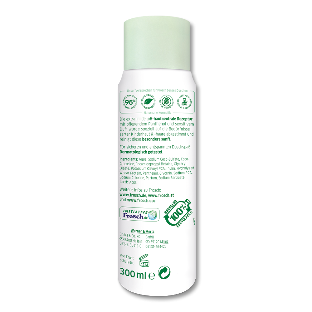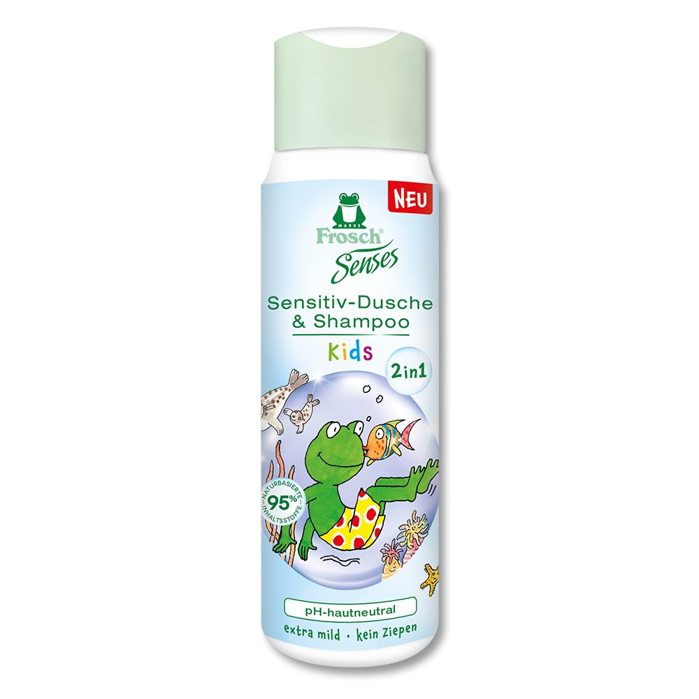 - Die Frosch Senses 2in1 Kids Dusche & Shampoo reinigt sanft empfindliche Kinderhaut und -haare und sorgt für sicheren und entspannten Duschspaß im turbulenten Familienalltag. Die extra milde, 5,5 pH-hautneutrale Formel mit pflegendem Panthenol und sensitivem Duft ist frei von Farbstoffen, EDTA, SLES, Parabenen, tierischen Inhaltsstoffen und Mikroplastik. Für leicht-kämmbare Haare dank pflegenden Oliventensiden, Weizenprotein und Inulin. Die sehr gute Hautverträglichkeit ist dermatologisch bestätigt. Für sensible Kinderhaut ab 6 Monaten geeignet.