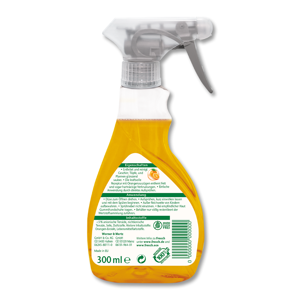 - Das Frosch Spül-Spray Orange reinigt Geschirr, Töpfe und Pfannen glänzend sauber. Die kraftvolle Rezeptur entfernt Fett und Eingebranntes besonders effektiv und hinterlässt einen frischen Orangenduft. In der Flasche zum direkten Aufsprühen.
