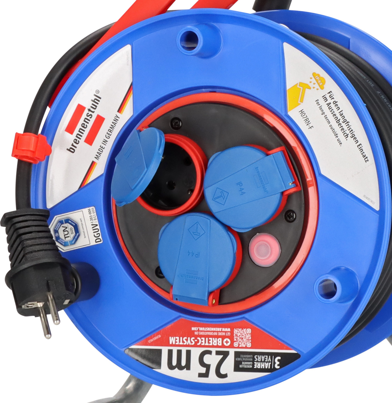25m Kabellänge (AT-N05V3V3-F 3G1,5) mit Bremaxx Kabel - einsetzbar bis -35 °C, UV-beständig und mechanisch hoch belastbarOutdoor-Kabeltrommel mit Überhitzungsschutz, Kontroll-Leuchte bei Überhitzung und ÜberlastungTrommelkörper aus Spezialkunststoff mit verstärkenden Rippen3 Schutzkontakt-Steckdosen, spritzwassergeschützt, mit selbstschließenden DeckelnInnovative