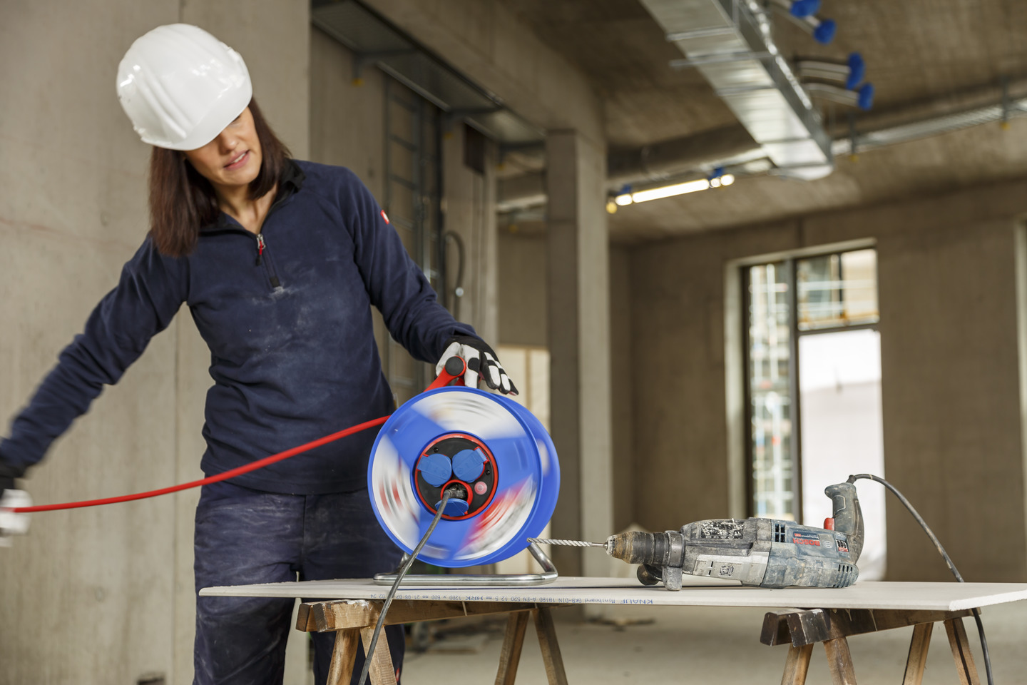 Mit Drehgriff für komfortables AufrollenRN-Kabel ist zugelassen für erschwerte Baubedingungen nach VDE 0100 Teil 704Innovativer
