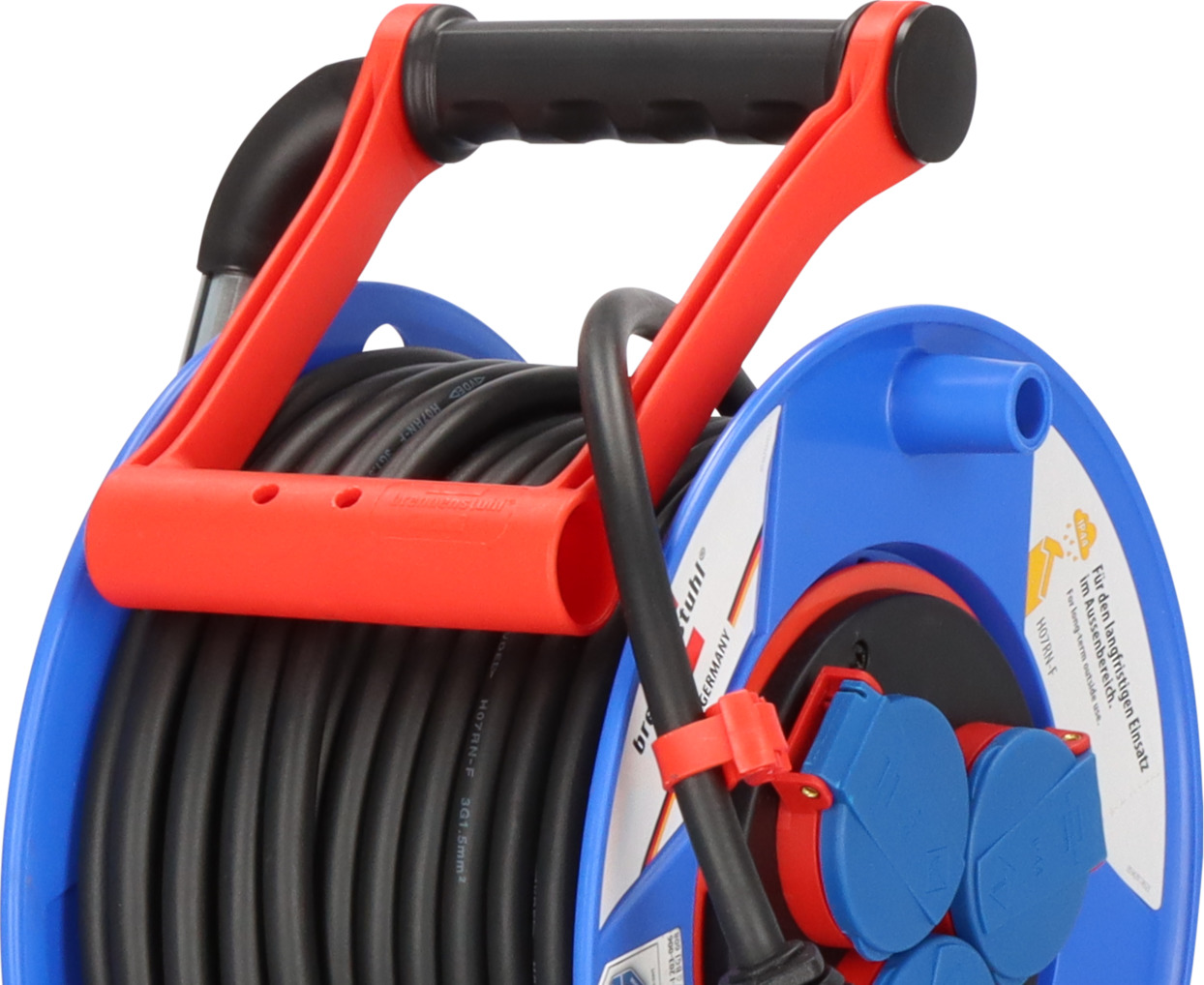 25m Kabellänge (AT-N05V3V3-F 3G1,5) mit Bremaxx Kabel - einsetzbar bis -35 °C, UV-beständig und mechanisch hoch belastbarOutdoor-Kabeltrommel mit Überhitzungsschutz, Kontroll-Leuchte bei Überhitzung und ÜberlastungKabeltrommel mit blauem Trommelkörper aus Spezialkunststoff auf verzinktem Tragegestell3 Schutzkontakt-Steckdosen, spritzwassergeschützt, mit selbstschließenden DeckelnKabeltrommel