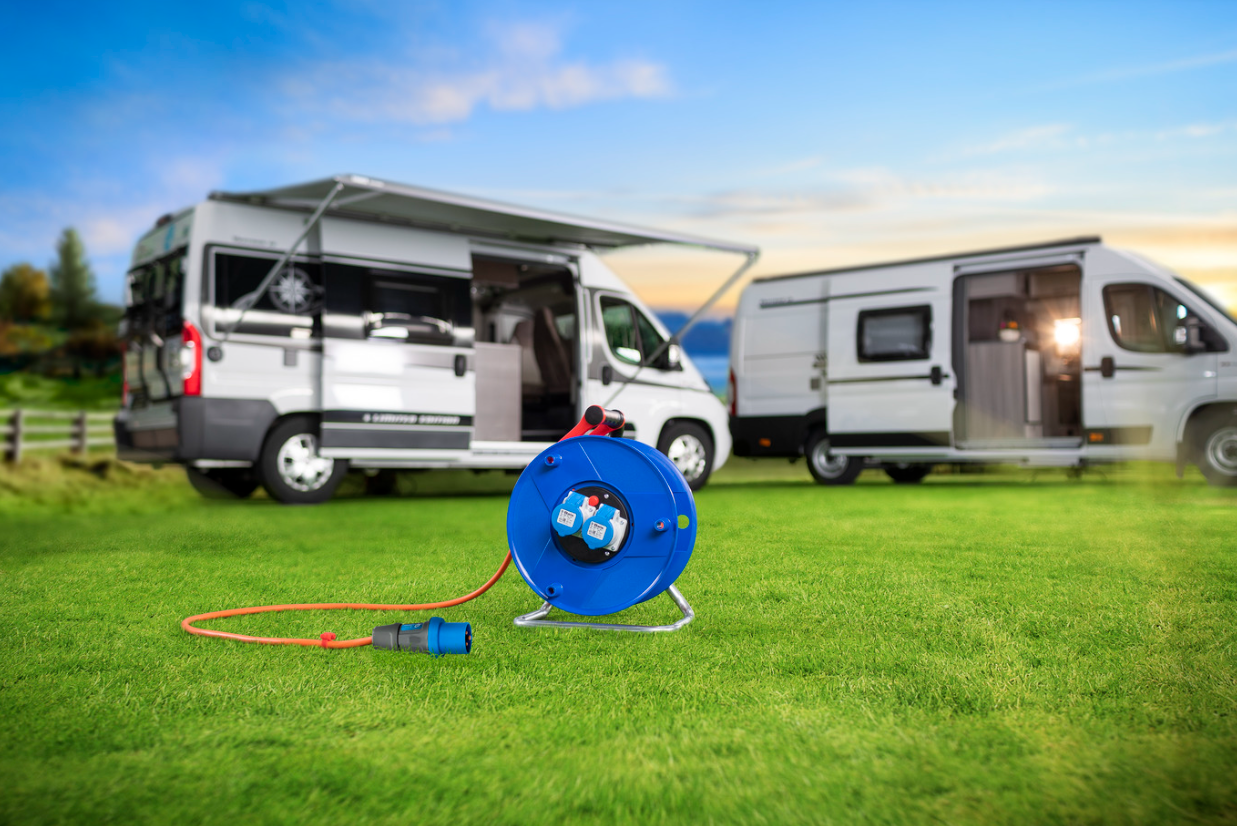 - CEE-Kabeltrommel mit CEE-Stecker (230V/16A) und 2x CEE Steckdosen mit Klappdeckeln dient als ideale Stromversorgung auf Campingplätzen.