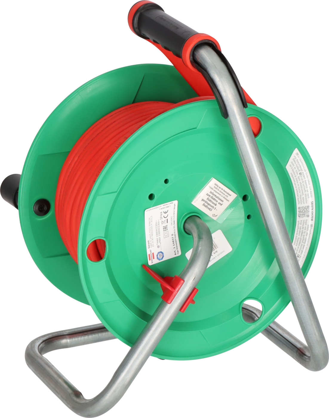 - Garten-Kabeltrommel mit Trommelkörper aus Spezialkunststoff auf verzinktem Tragegestell mit zusätzlichem Überhitzungsschutz und Kontroll-Leuchte bei Überhitzung und Überlastung