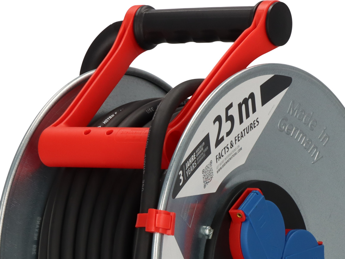 25m Kabellänge (AT-N05V3V3-F 3G1,5) mit Bremaxx Kabel - einsetzbar bis -35 °C, UV-beständig und mechanisch hoch belastbarOutdoor-Kabeltrommel mit Überhitzungsschutz, Kontroll-Leuchte bei Überhitzung und ÜberlastungTrommelkörper aus Spezialkunststoff mit verstärkenden Rippen3 Schutzkontakt-Steckdosen, spritzwassergeschützt, mit selbstschließenden DeckelnInnovative