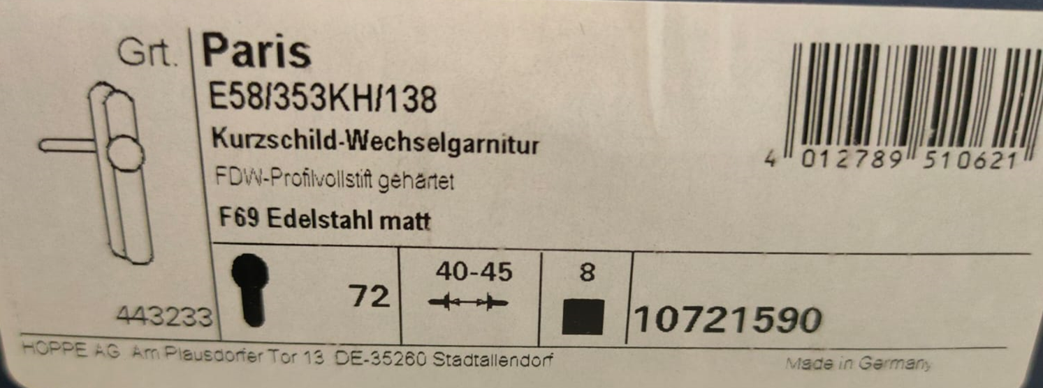 Edelstahl- Kurzschild-Wechselgarnitur E58/353KH/138 F69 8 PZ-72 40-45 10721590