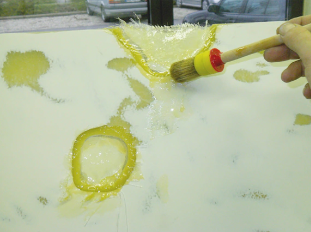 Untergrund muss sauber, trocken und fettfrei sein. Betroffene Stelle mit grobem Schleifpapier vorbereiten. Glasmatte in Form reißen. Durch das reißen wird der Übergang mehrerer Lagen nivelliert. Die zu reparierende Stelle mit Reparaturharz VAKU 80 einstreichen, Glasmatte aufbringen und mit Reparaturharz VAKU 80 tränken.