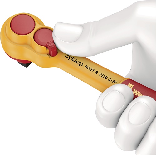 10 mm (3/8 ″)-Vierkantantrieb · VDE isoliert gem. IEC 60900 · schlanke Bauform · feinverzahnt · Nussverriegelungsfunktion mit Druckknopfauslösung