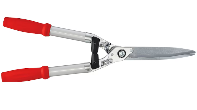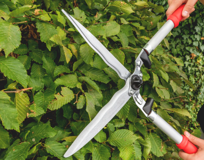 ...Hochwertige Heckenschere mit Aluminiumgriff, Wellenschliff-Klingen und Saftrillen