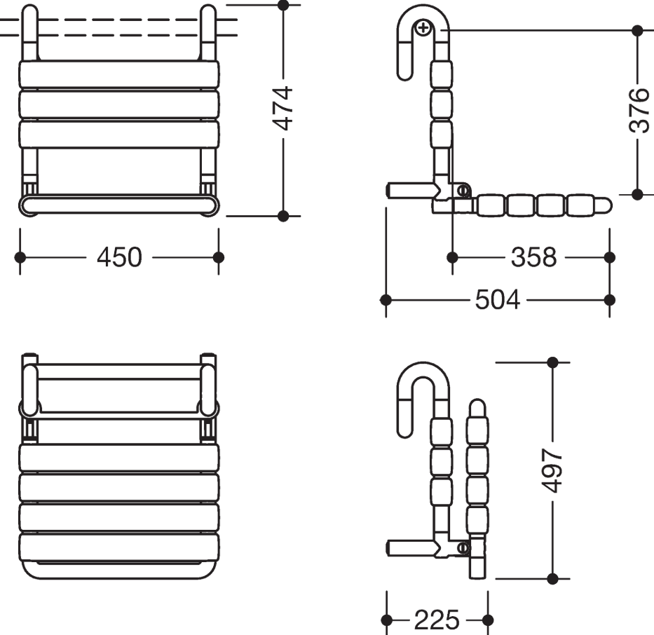 HEWI Einhängesitz, klappbar der Serie 801 Konstruktion aus Stangen, Sitz- und Rückenelementen, mit durchgehendem, korrosionsgeschütztem Stahlkern, mit platzsparend hochklappbarer Sitzfläche. 450 mm breit, 473 mm hoch und 504 mm tief, Sitzfläche 450 mm breit und 358 mm tief, Sitzelemente 60 mm breit, zum Einhängen in Duschhandläufe und Haltegriffe, Stangendurchmesser 33 mm, Sitzfläche belastbar bis max.150 kg, aus hochwertigem Polyamid nach HEWI Farbtabelle.