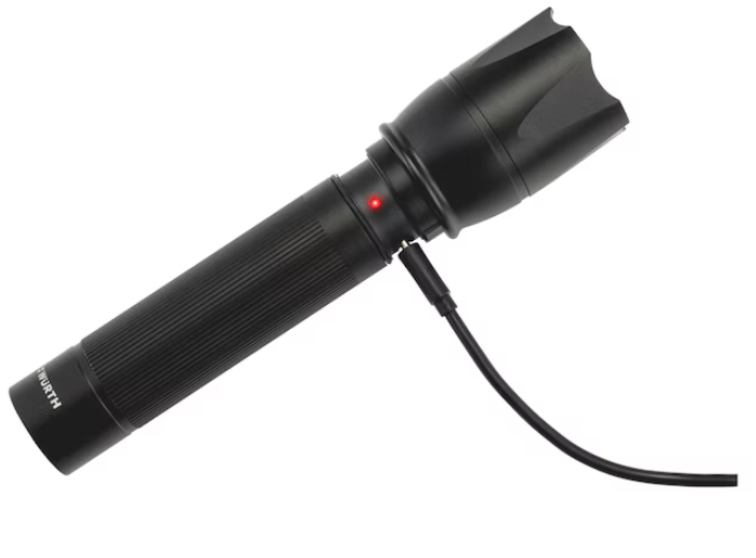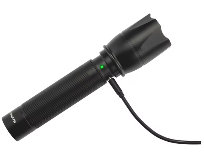Leuchte, Holster, Trageschlaufe, Ladekabel USB-A/USB-C 100 cm, Lithium-Ionen Akku Typ 18650, Bürste