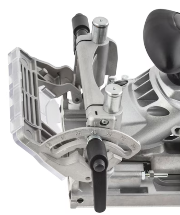 - Für Gehrungsverbindungen von 0-90° stufenlos, mit Rasterung für 22,5°, 45° und 67,5°, in der Höhe verstellbar