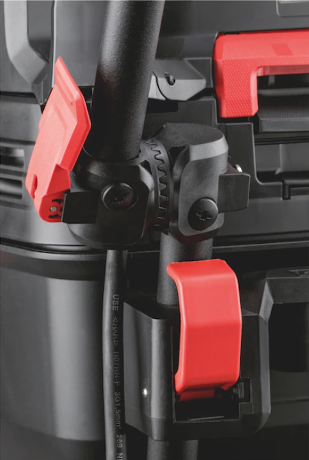 - Integrierte Aufbewahrung der Fugendüse und Werkzeugmuffe mit Schnellverbindungen, flexible Schlauch- und Netzkabelaufbewahrung
