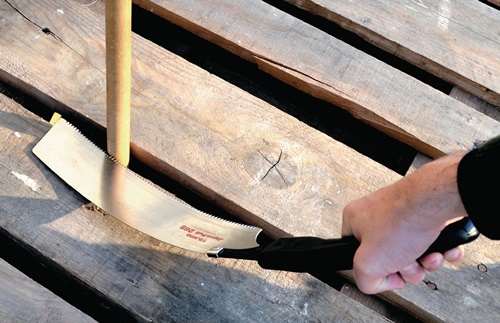 mit Pistolengriff · Zugsäge mit Kreuzschliff · bewährte 3-fach-Zahnung · ist für Schnitte in Faserrichtung und quer zur Faser in allen Holzarten geeignet · mit Standardzahnung · alle Zähne der Sägeblätter sind induktiv gehärtet · einfachstes Wechseln der Sägeblätter durch Abknicken des Sägegriffes