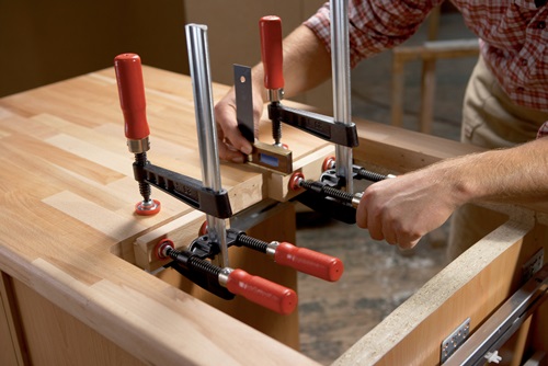 praktisches Zusatzwerkzeug · aus Temperguss · Spindel verzinkt · handgerechtes Holzheft · rot lackiert · passend für alle handelsüblichen Schraubzwingen mit max. Schienendicke von 13 mm