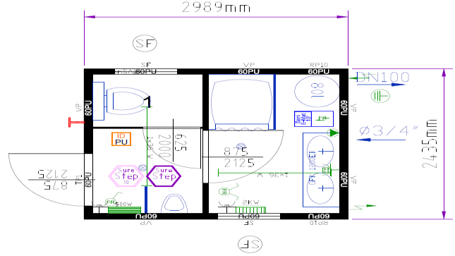 - 1 Druckreduzierventil inkl. Wasserfilter, rückspülbar Zu- und Ablauf im Paneel versenkt, Position und Dimensionen gem. Skizze