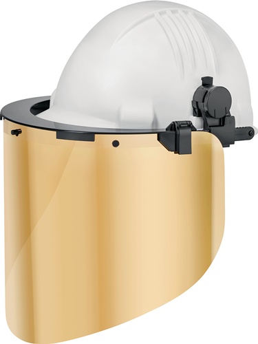 aus Polycarbonat · Befestigung am Helm mittels 30 mm Slots · passend für viele gängigen Industrieschutzhelme · die Schutzscheiben können mit einem 4-Punkt-Rastergelenk hochgeklappt werden · 240 x 250 x 70 mm
