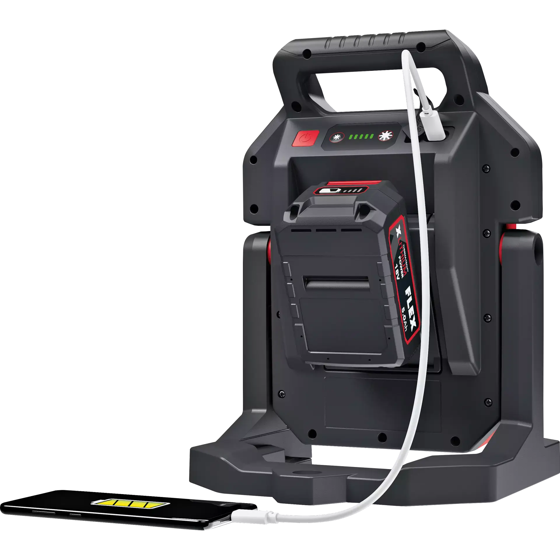- Leistungsstarker 5000 Lumen Akku-Baustrahler mit 5 Helligkeitsstufen plus ECO Modus. Mit Memory Funktion, das Licht startet mit der zuletzt eingestellten Stufe