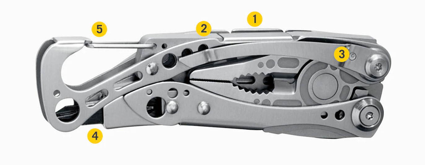 - Außenliegende Funktionen: Dieses Multi-Tool verfügt über Tools, die zugänglich bleiben, auch wenn das Tool verriegelt oder geschlossen ist.