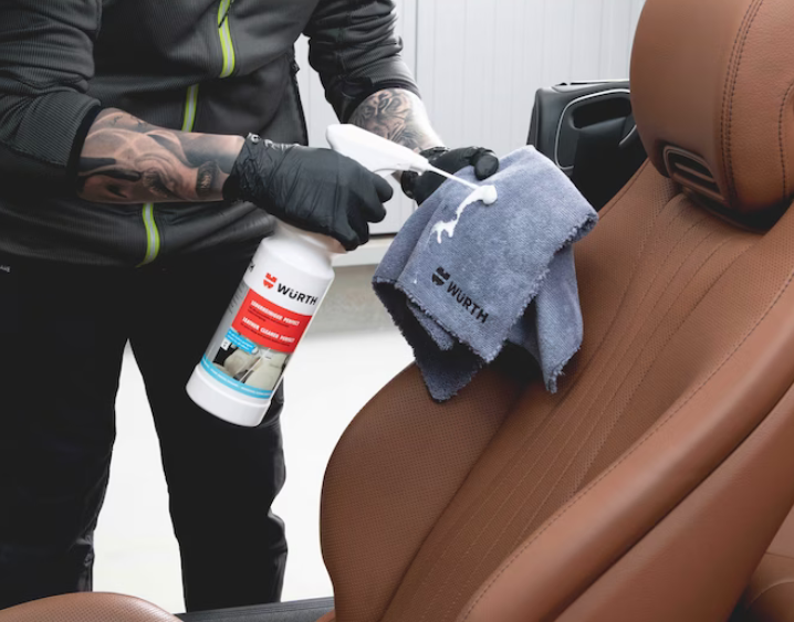 Losen Schmutz absaugen. Reiniger auf eine Textil- und Lederbürste oder Schwamm sprühen und in das Leder einmassieren. Anschließend mit feuchtem Mikrofasertuch gründlich abwischen. Nach der Reinigung empfiehlt es sich zum Schutz, zur Pflege und zur Versiegelung des Leders Ledrpflege Perfect zu verwenden.