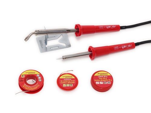 Set mit 2 Lötkolben mit unterschiedlichen Leistungswattstufen - diese ermöglichen die Bearbeitung sowohl feiner Verbindungen als auch größerer Lötstellen · mit Flussmittel versehenes Elektroniklot - gewährleistet eine mühelose Verarbeitung und Bildung zuverlässiger Verbindungen an anspruchsvollen Stellen · Lötfett verbessert das Fließverhalten des Lots und optimiert den Kontakt auf schwierigen Materialien, insbesondere beim Verzinnen von Litzen sollte Lötfett verwendet werden · Entlötlitze erlaubt das effektive Entfernen von überschüssigem Lot, wodurch Lötstellen schnell und unkompliziert korrigiert bzw. flüssiges Lot entfernt werden kann · für Elektronikarbeiten und kleinere Reparaturen · inkl. Geräteablage