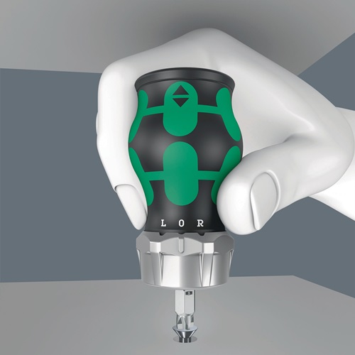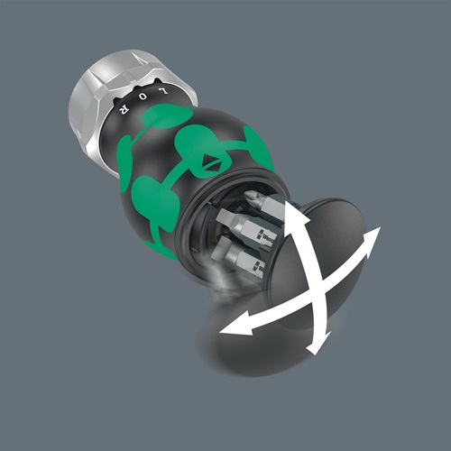 mit zweikomponenten Kraftform Stubby Griff · mit integrierten Bit Magazin (6 Bits) · Ratschenfunktion und Umschaltung (rechts/fest/links) · Bitaufnahme mit starkem Dauermagnet · bestückt mit zähharten Bits ohne Farbleitsystem · besonders kleine Bauform für schwer zugängliche Stellen