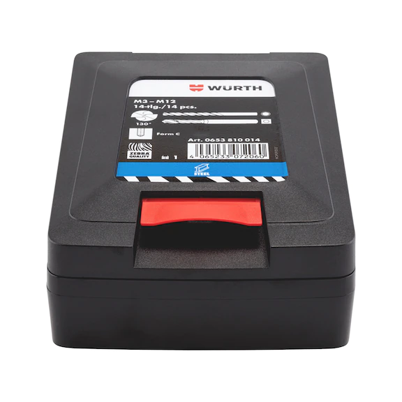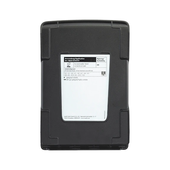 ...bestehend aus Präzisionsspiralbohrern und Grundloch-Gewindebohrern für die Bearbeitung von langspanenden, unlegierten Stählen bis 850 N/mm² Festigkeit. Erhältlich in der ORSY® System-Kassette.