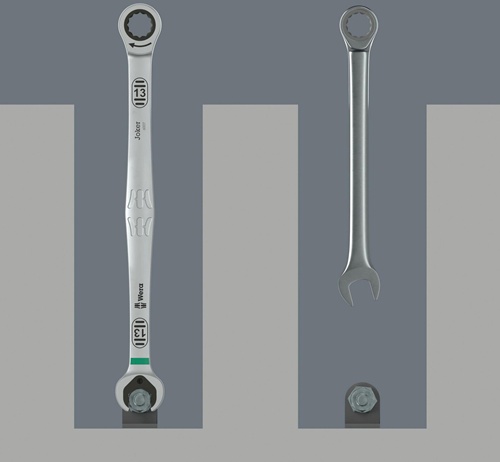 einzigartige Kombination aus Maul- und Ring-Ratschenmechanik in langer Ausführung · langer Hebel ermöglicht höhere Kraftübertragung · bessere Zugänglichkeit bei tiefliegenden Verschraubungen · kein Abrutschen durch Endanschlag · mit praktischer Haltefunktion durch Metallplatte im Maul