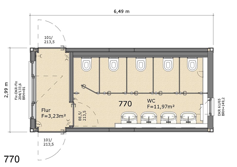 Der Ungrund-Modul Typ 770 als Sanitärmodul ist ein ca. 6,50 m langes und 2,99 m breites Modul, das einzeln genutzt werden kann oder die Grundlage für weitere Räume bietet, die dann aus mehreren Moduleinheiten besteht. Mit dem Typ 704 und 706 kann beispielsweise schnell um einen Doppelraum erweitert werden. Der Modul Typ 770 ist ideal zum Einsatz als einzelne Sanitäreinheit oder mit seinem Vorflur ideal geeignet als Durchgangsmodul mit den seitlichen Türen geeignet. Er ist robust, langlebig und kann auch in schwierigen Umgebungen verwendet werden. Seine präzise Verarbeitung und sein modernes Design machen ihn zu einem idealen Modul für eine Vielzahl von Anwendungen. Der Modultyp 701 ist eine hervorragende Wahl für Menschen, die einen Raum benötigen, der schnell und einfach erweitert werden kann. Mit diesem Modul können Sie den Raum Ihren Bedürfnissen anpassen und zu einem Ort machen, an dem man sich wohlfühlt.