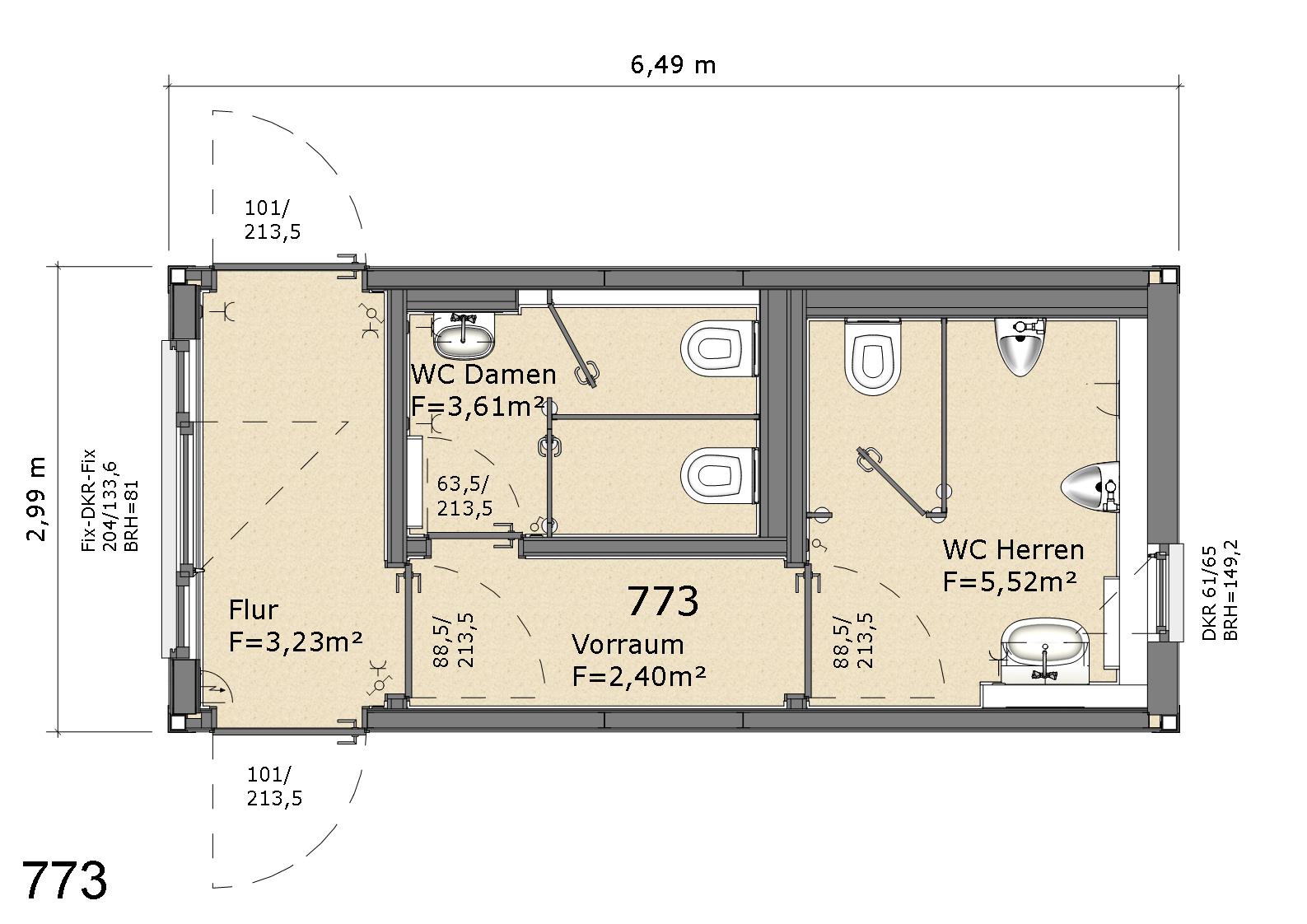 Der Ungrund-Modul Typ 773 als Sanitärmodul ist ein ca. 6,50 m langes und 2,99 m breites Modul, das in der Regel innerhalb von Modulanlagen oder auch einzeln zum Einsatz kommt. Das Modul eignet sich sehr gut zum Anschluss weiterer Räume die dann durch einen gemeinsamen Flur erschlossen werden. Das Modul ist robust, langlebig und kann auch in schwierigen Umgebungen verwendet werden. Seine präzise Verarbeitung und sein modernes Design machen ihn zu einem idealen Modul für eine Vielzahl von Anwendungen. Der Modultyp 773 ist eine hervorragende Wahl für Menschen, die einen Raum benötigen, der schnell und einfach erweitert werden kann. Mit diesem Modul können Sie den Raum Ihren Bedürfnissen anpassen und zu einem Ort machen, an dem man sich wohlfühlt.