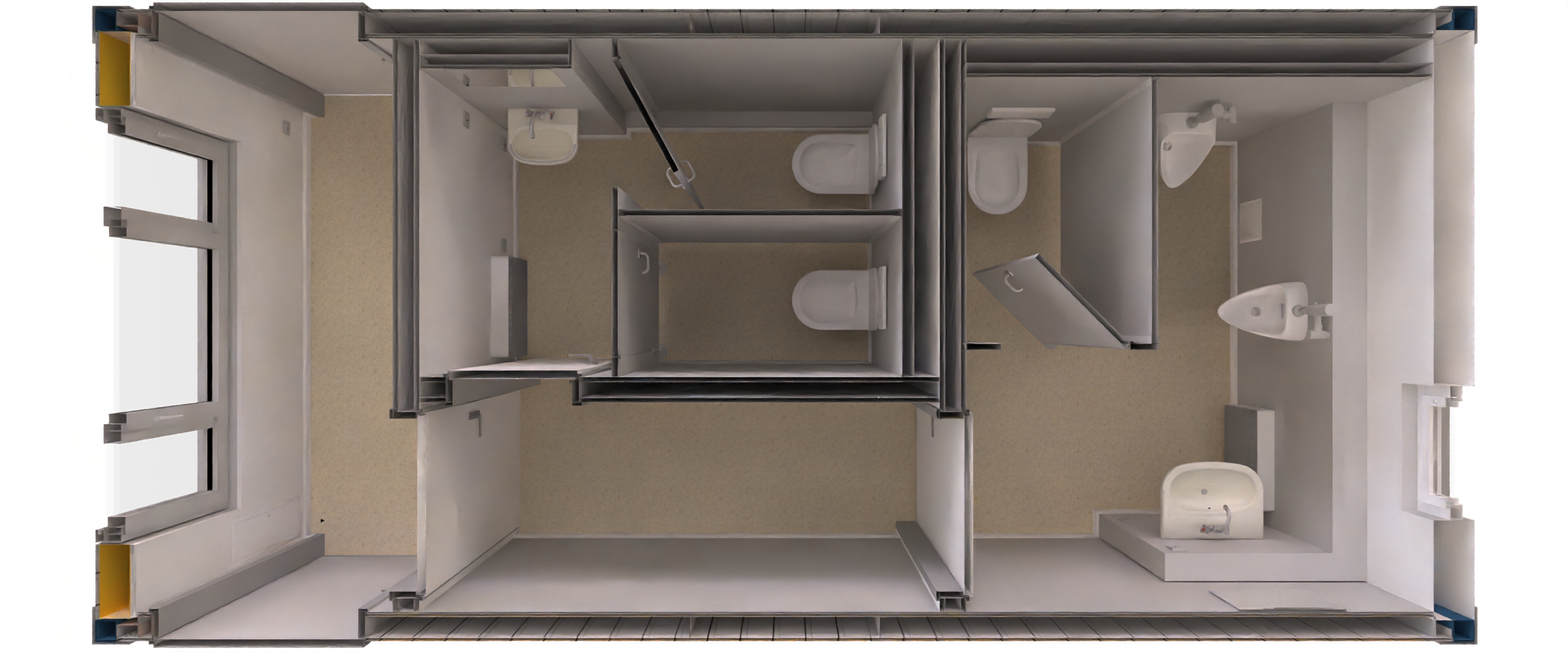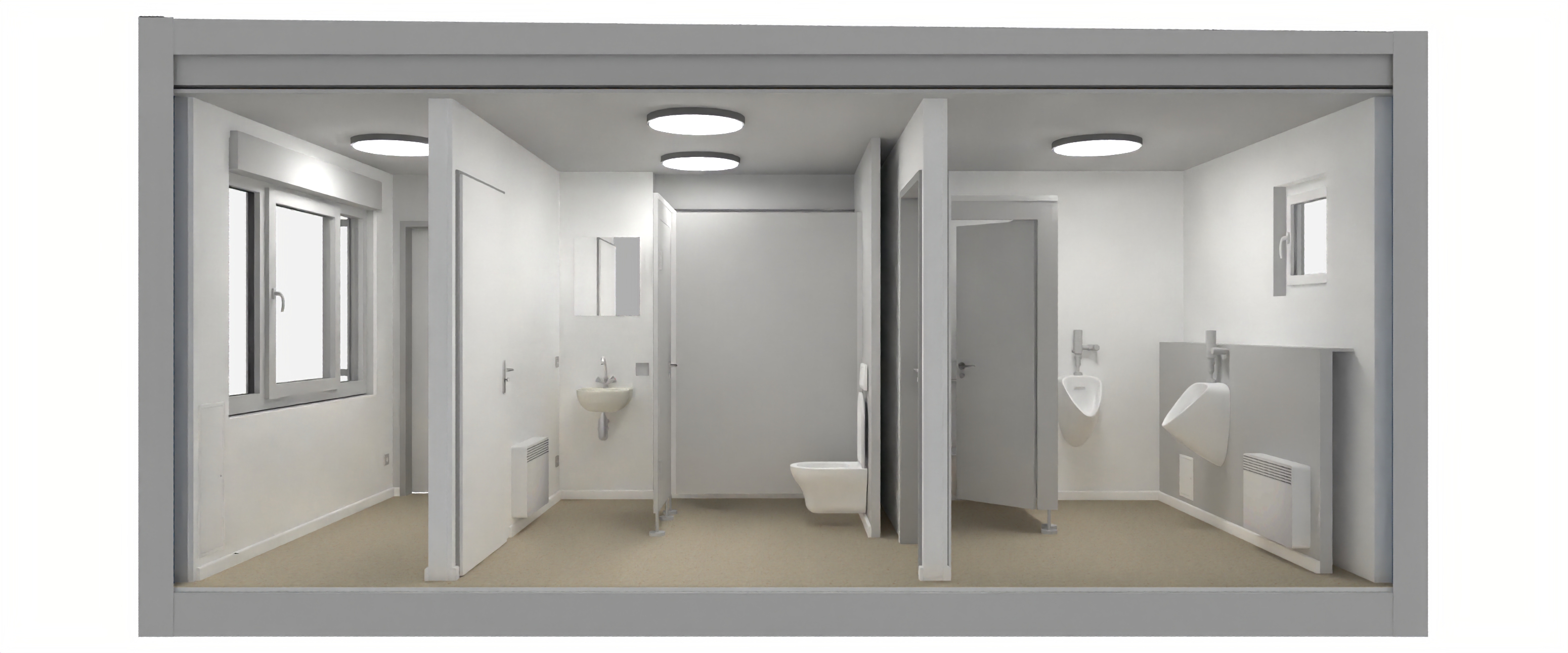 ...geschlossener Modulcontainer mit eingebauten WC Kabinen und Waschbecken für Damen und Herren. Das Modul enthält die fertige Elektrik sowie eine Ausführung mit Standard Boden- und Wandbelägen.