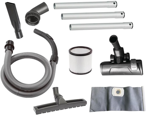zum Saugen von Flüssigkeiten, Spänen und anderen Feststoffpartikeln · integrierte Steckdose zum Anschluss von Elektrowerkzeugen · Anlaufautomatik beim Einschalten eines angeschlossenen Elektrowerkzeugs · Auslassventil am Behälter für einfaches Entleeren von Flüssigkeiten · manuelle Filterabreinigung für freie Filter und gleichbleibend hohe Saugkraft · inklusive dreiteiligem Aluminium Saugrohr · Blasfunktion zum Reinigen von schwer erreichbaren Lücken · praktische, verstellbare Halteklammern zum sauberen Verstauen des Kabels · wiederverwendbare Filterbeutel im Lieferumfang schonen die Umwelt