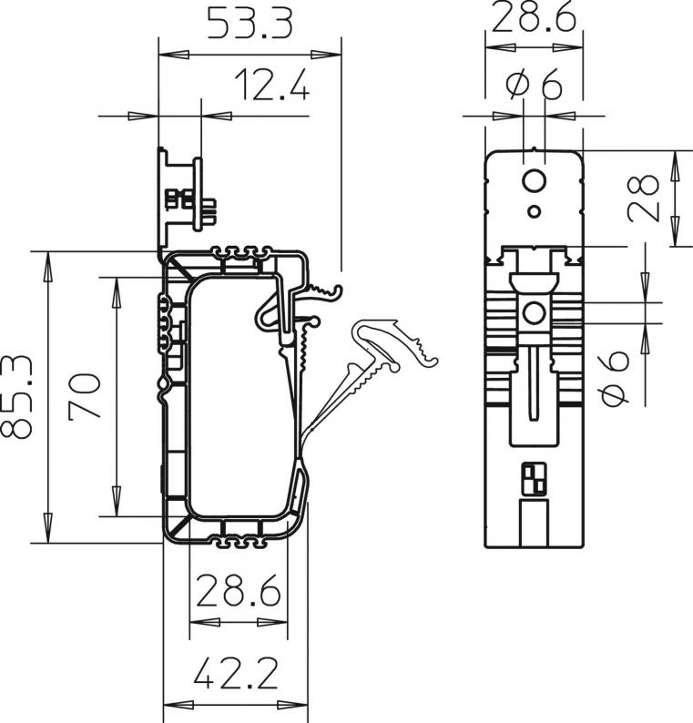Steingraue Ausführung, flammwidrig nach DIN VDE 0471/DIN IEC 695 Teil 2-1, Prüftemperatur 960 °C. Mit multifunktionalem Befestigungselement.