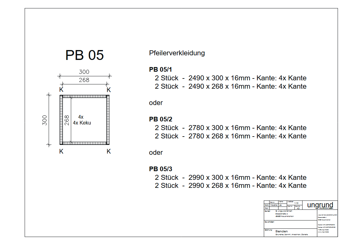 PB 05/1 Pfeilerverkleidung mit KeKu (für 4 Stützen), 2 Stück 2490 x 300 x 16 - 4 x Kante / 2490 x 268 x 16 4x Kante
