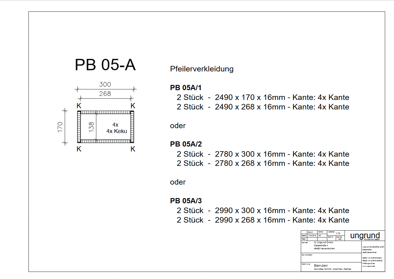 PB 05A/2 Pfeilerverkleidung mit KeKu (für 4 Stützen) 2 Stück 2780 x 300 x 16 - 4x Kante / 2 Stück 2780 x 268 x 16 4x Kante