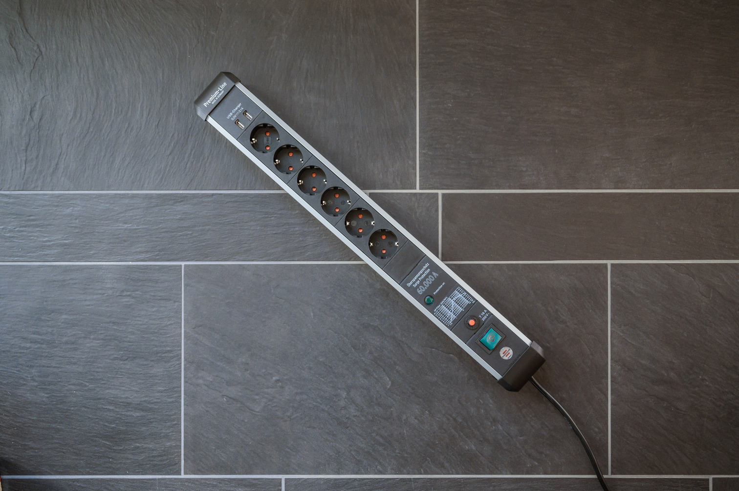Super-Solid Steckdosenleiste mit Blitzschutz in der Farbe schwarz mit lichtgrauen Steckdosen