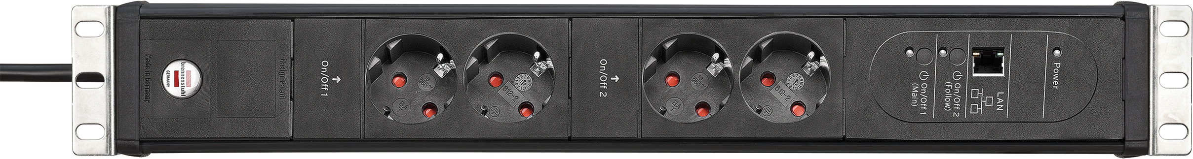 Die Premium-Web-Line V3 Internet-Steckdosenleiste 4-fach (Mehrfachsteckdose in 19" mit Main-Follow Funktion, LAN-Anschluss, 3m Kabel, Made in Germany)