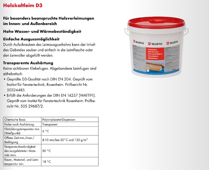 Holzkaltleim D3 einseitig mit Leimroller, Leimspachtel, Leimpinsel oder mit Auftragsmaschinen dünn und gleichmäßig auftragen. Weitere Informationen finden Sie im Technischen Datenblatt.