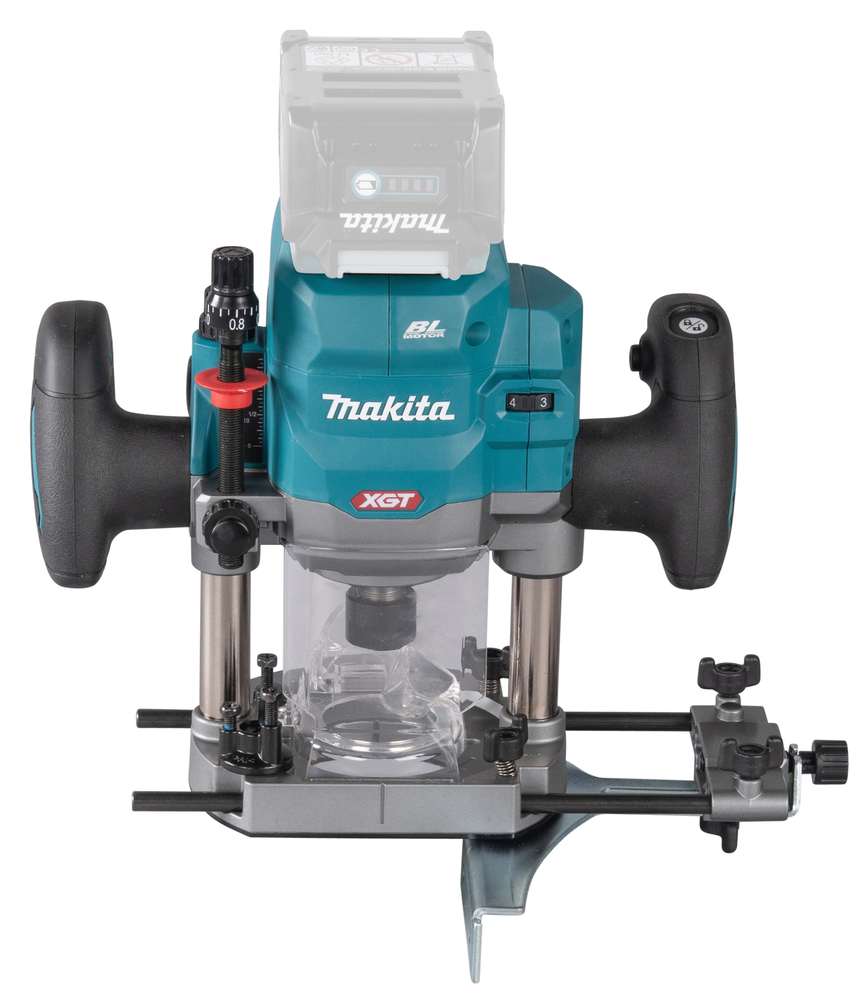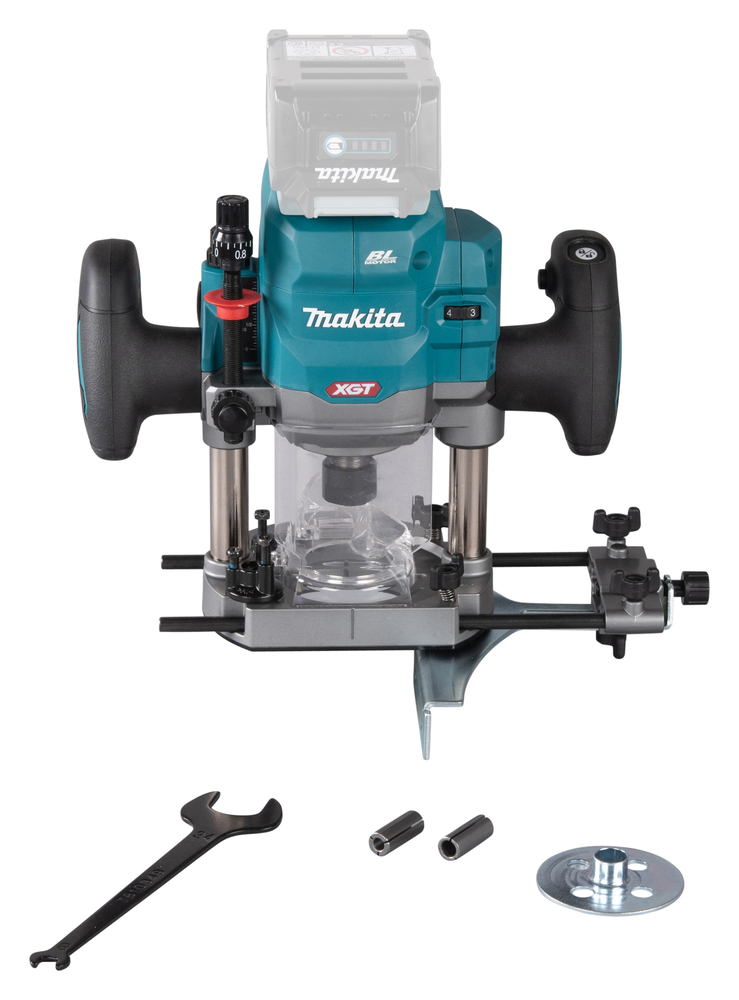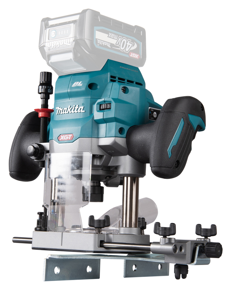 Akku-Oberfräse mit 40V max. Antrieb für hohe Kraftentfaltung und satten Durchzug auch in harten Materialien, Die Ausgangsleistung entspricht der einer 1.700 Watt Maschine. Die Spannzange ist geeignet für alle Fräswerkzeuge mit 12 mm-Schaft. Der Fräskorbhub beträgt 60 mm. Die Schnellbremse sorgt für sofortigen Stopp und verhindert Beschädigungen am Werkstück.