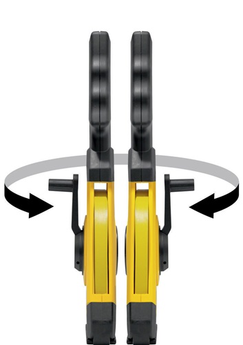 Y-Rahmen · Stahlband mit metrischer Skala · einfacher Wechsel der Kurbel von Rechts- auf Linkshänderbetrieb · ergonomischer Softgrip-Handgriff · extrem widerstandsfähige Ummantelung schützt das Band vor Korrosion und Abrieb · Universalhaken: variable Befestigungsmöglichkeiten dank ausklappbarem SPIKES-Haken - für sicheren Halt beim Ziehen des Bandes · integrierte Nagel-Öse im Haken · Kunststoffring: einfaches Hinzurechnen zur gemessenen Länge - 2 cm zwischen Nullpunkt und Nagelkerbe, 5 cm zwischen Nullpunkt und Ringanfang · Nullpunkt ist am Anfang des Bandbeschlages · Gehäuse aus PC/ABS-Kunststoff