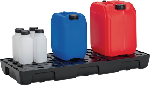 für Kleingebinde · zur sicheren und vorschriftsmäßigen Lagerung gewässergefährdenden Flüssigkeiten der GHS-Kategorien 1-4 · aus HD-Polyethylen · sehr beständig gegen Laugen, Öle und Säuren · mit PE-Rost · stapelbar · konzipiert für verschiedene Regaltiefen · mit DIBT-Zulassung Nr. Z-40.22-601