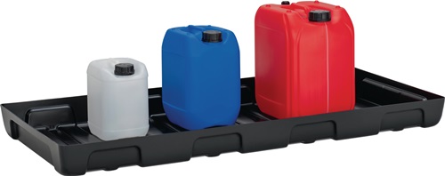 für Kleingebinde · zur sicheren und vorschriftsmäßigen Lagerung gewässergefährdenden Flüssigkeiten der GHS-Kategorien 1-4 · aus Polyethylen · sehr beständig gegen Laugen, Öle und Säuren · ohne PE-Rost · stapelbar · konzipiert für verschiedene Regaltiefen · mit DIBT-Zulassung Nr. Z-40.22-601